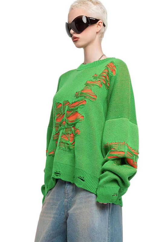 Loose-Fit Sweater with Round Neckline and Distressed Holes