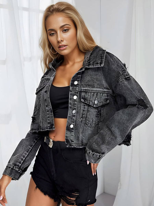 Raw edge ripped denim short jacket
