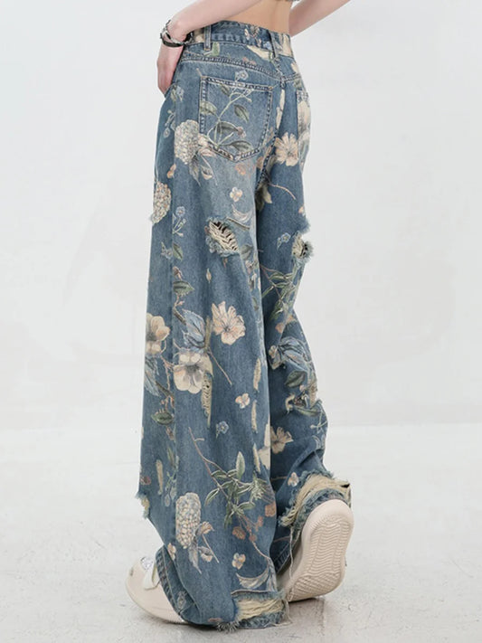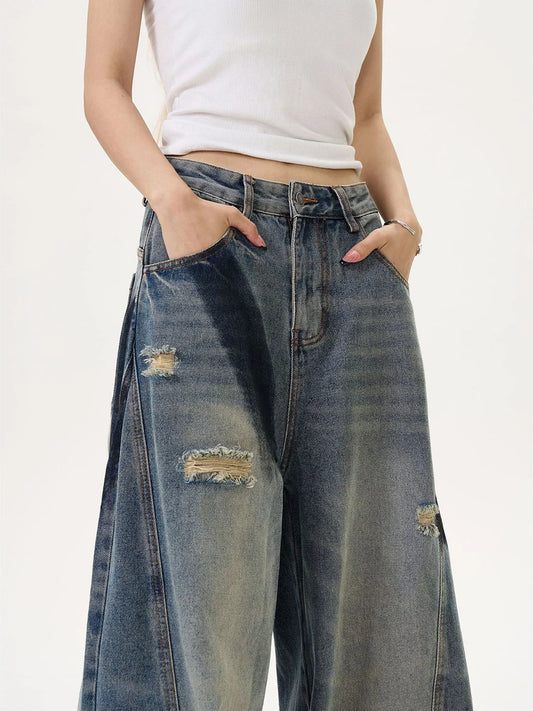 Loose-fitting wide-leg ripped and spray-painted distressed jeans