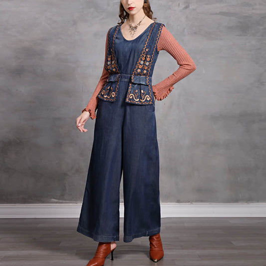 Simple casual retro embroidered denim jumpsuit