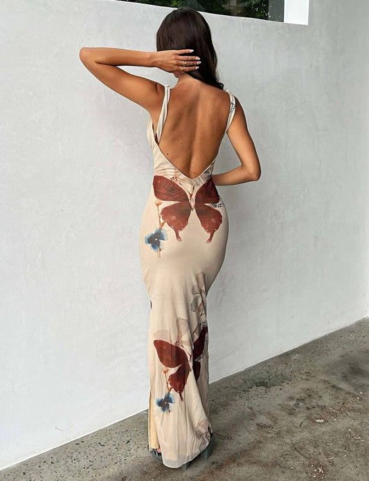 Robe longue fendue et ajustée à imprimé papillon et col en V