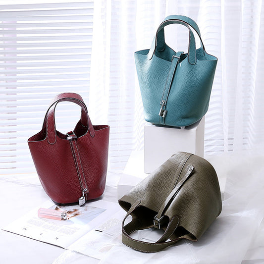 Sac seau en cuir de vachette à couche supérieure à motif litchi