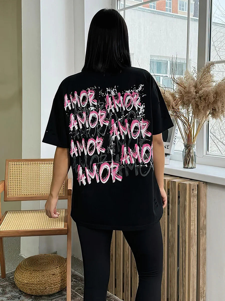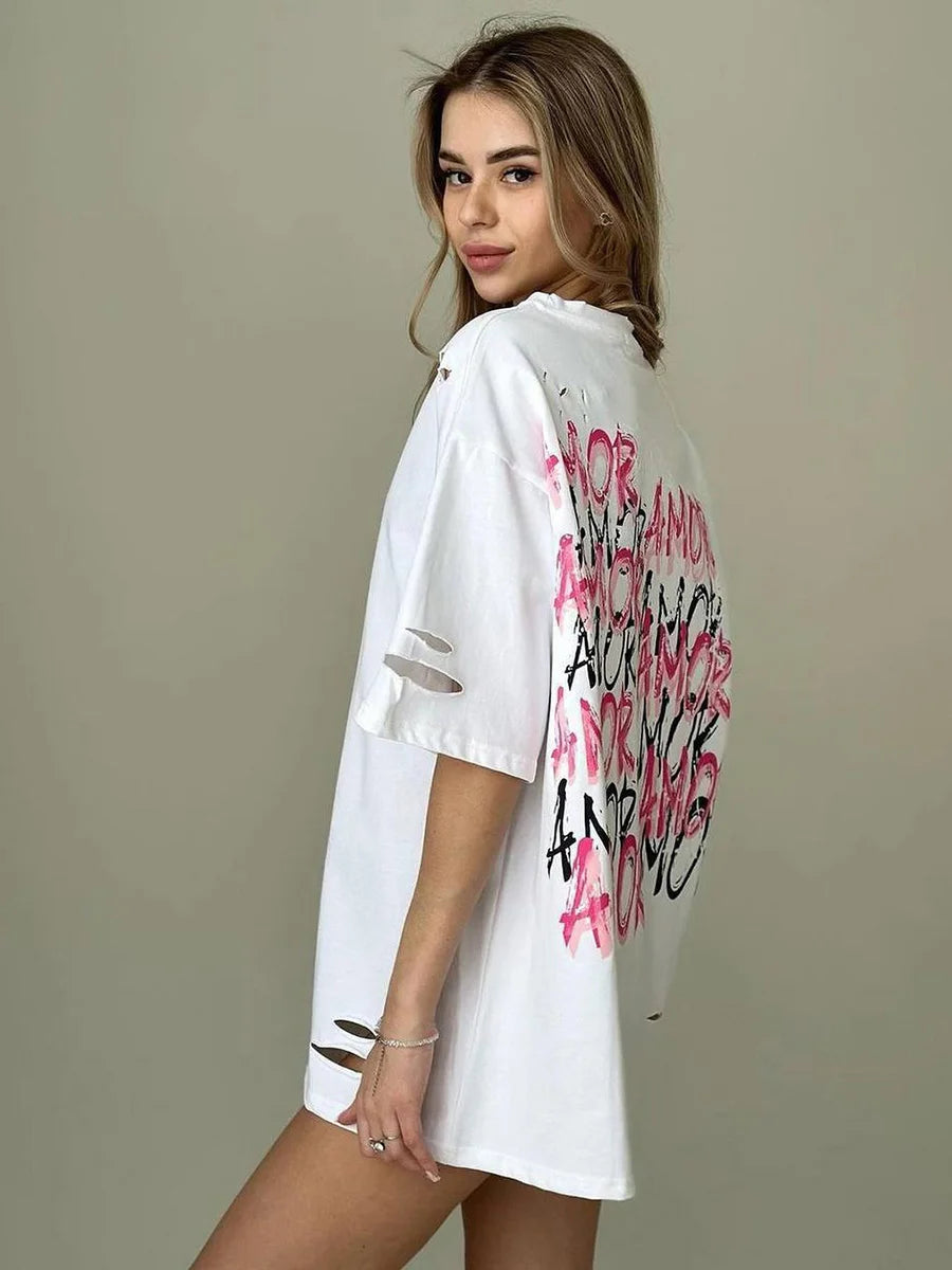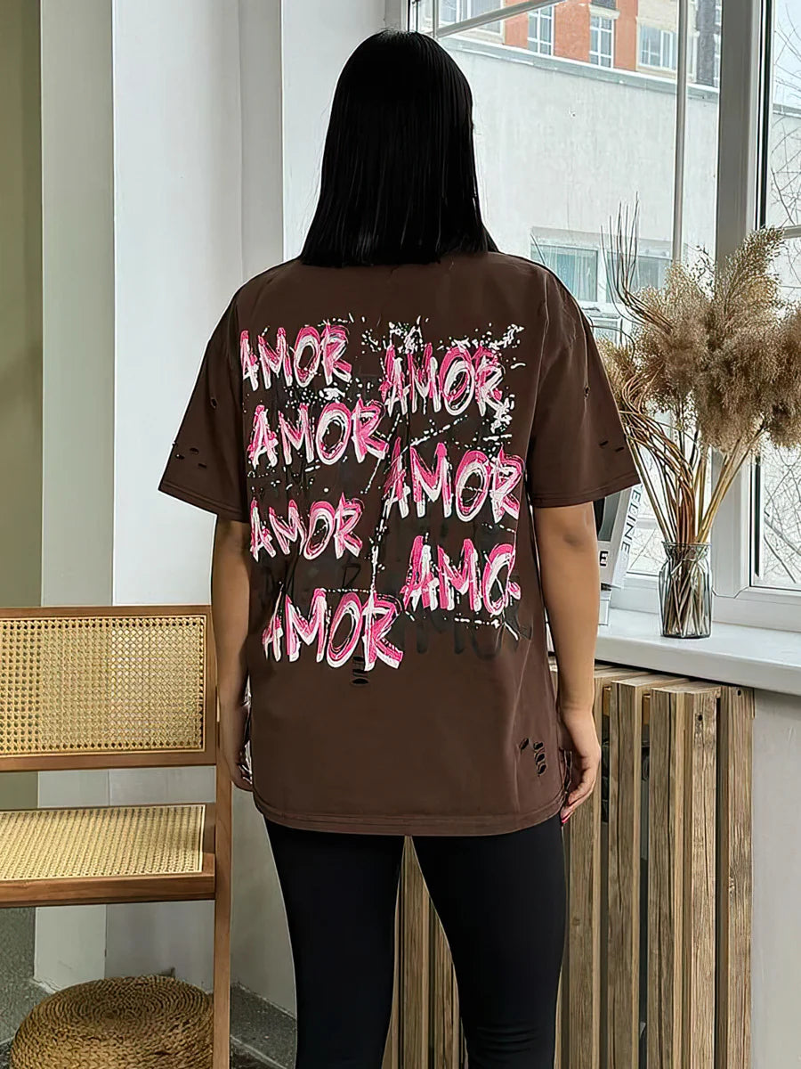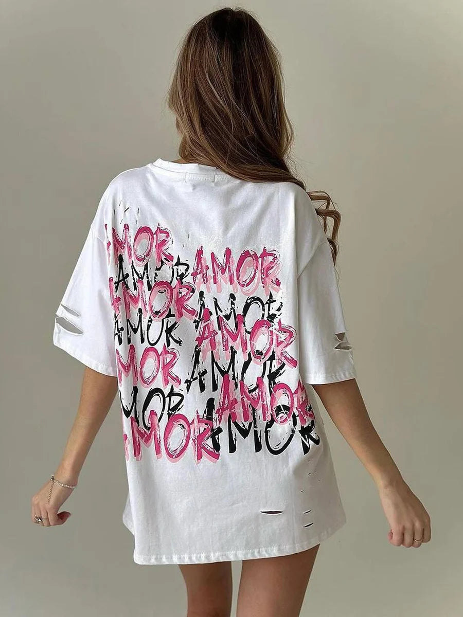 Letter Printed Worn Short Sleeve Women's T-shirt